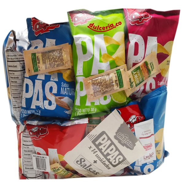 Deliciosas papas freídas con sabores a: Limón, Natural, Pollo, BBQ, cada una tiene un peso de 30 g, y vienen con salsa showy, el paquete trae 14 unidades.